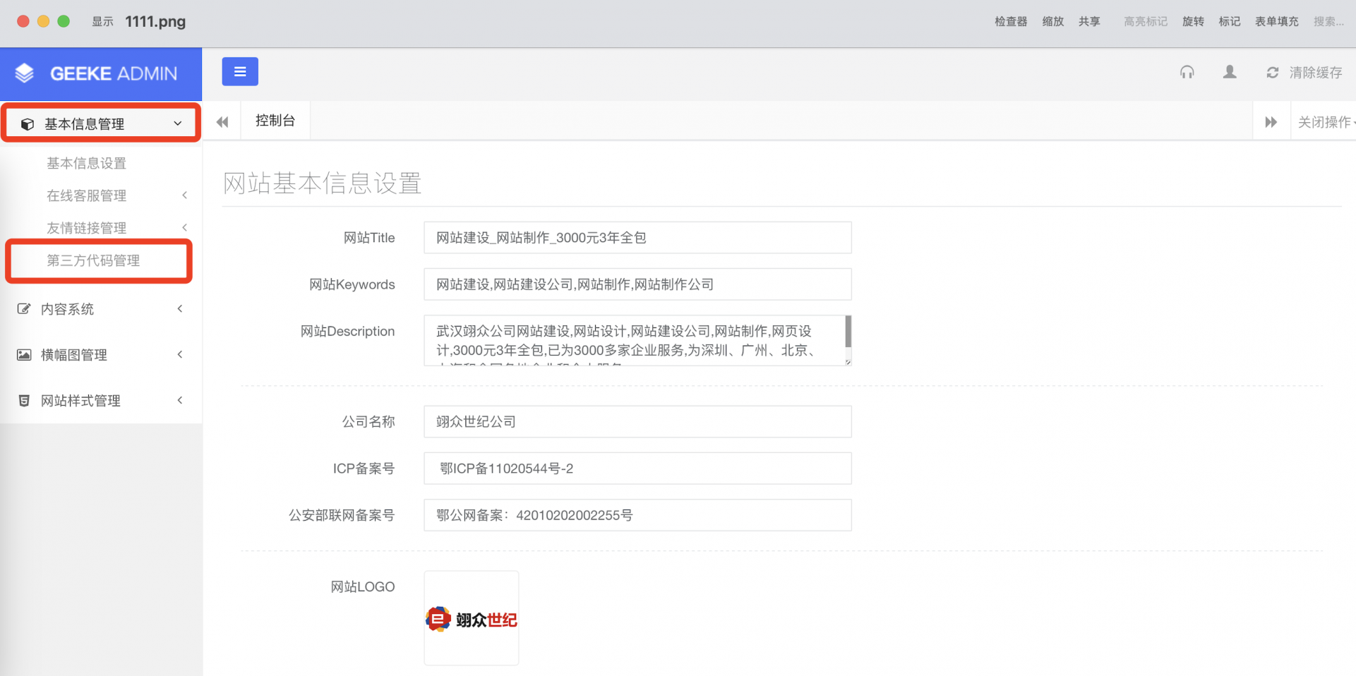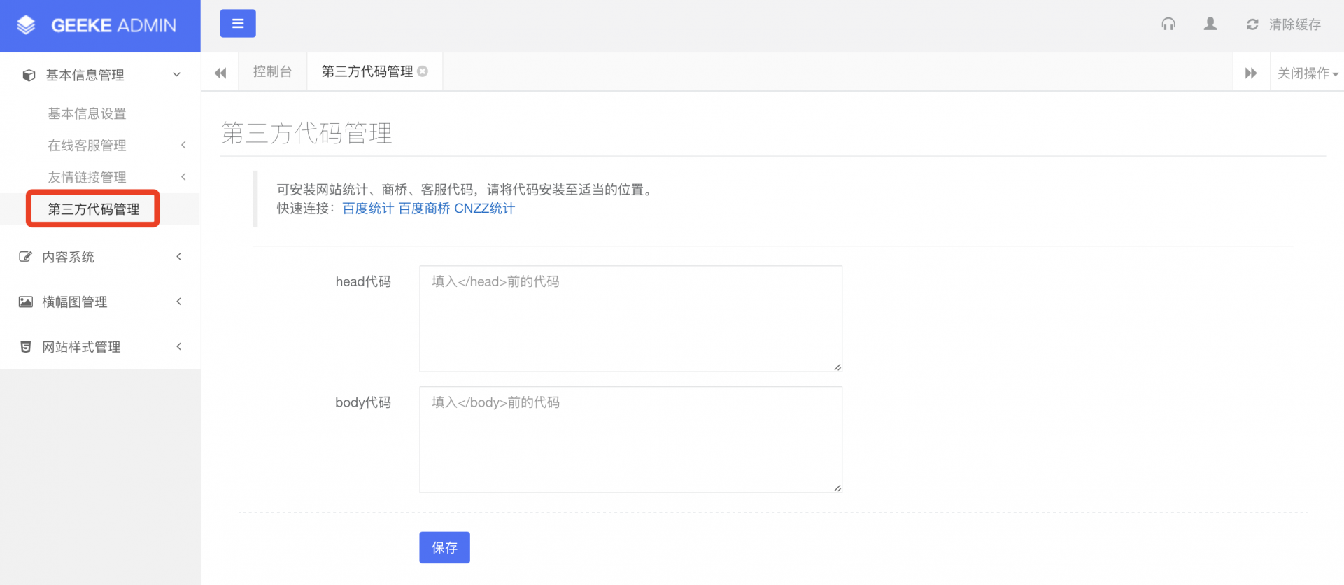 第一步:一般的网站后台内容管理系统登陆后都会有一个第三方代码管理入口,我们的后台管理系统的第三方代码在基本信息管理里面,点击基本信息管理后点击第三方代码,如图: