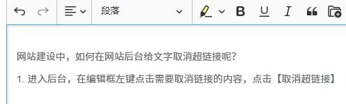 1. 进入后台,在编辑框左键点击需要取消链接的内容,点击【取消超链接】