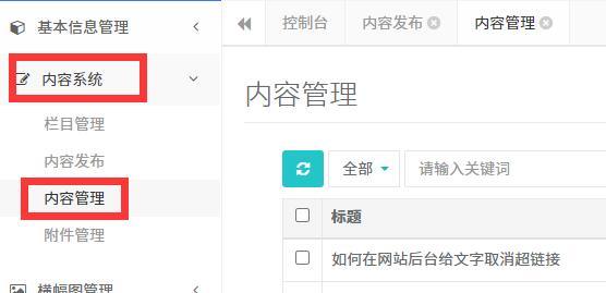 1. 进入后台,点击左侧菜单栏中的【内容系统】,在里面找到并点击【内容管理】