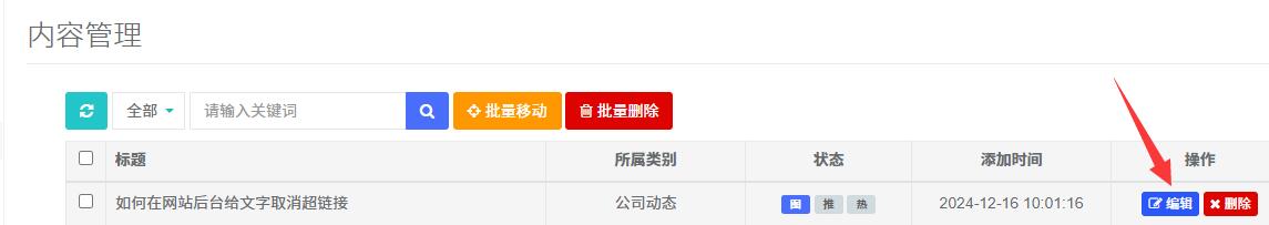 2.在右侧【内容管理】找到需要修改发布时间的内容,选择【编辑】