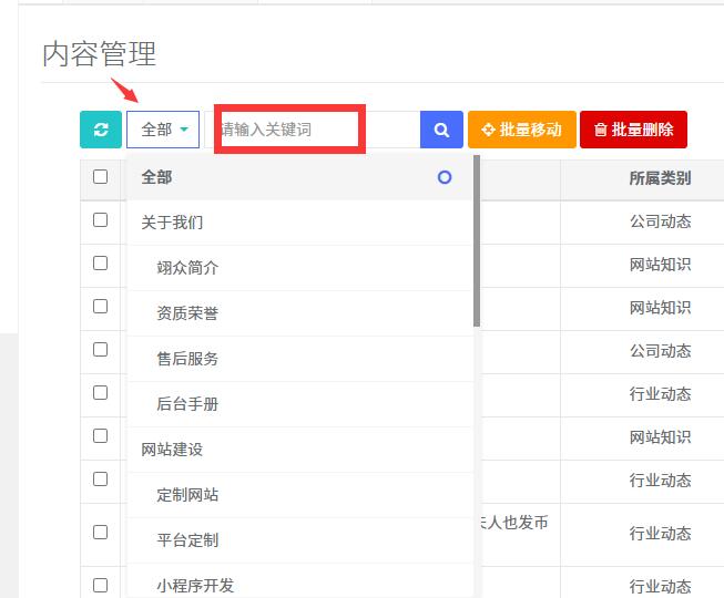 2.在右侧【内容管理】可通过栏目搜索或关键词搜索文章