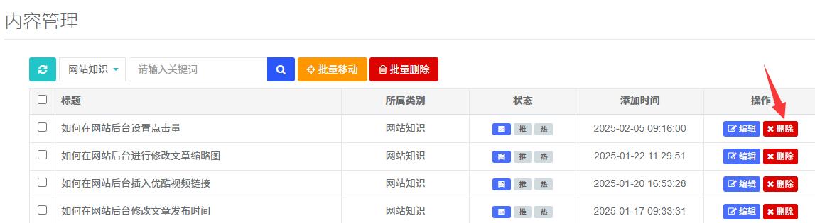 3.找到需要删除的新闻,点击最右侧【删除】,删除后内容无法恢复。