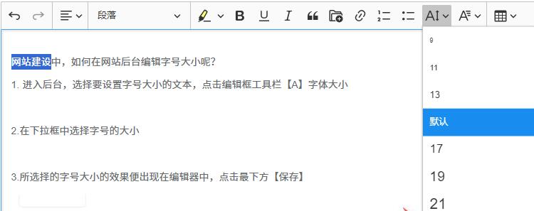 1. 进入后台,选择要设置字号大小的文本,点击编辑框工具栏【A】字体大小