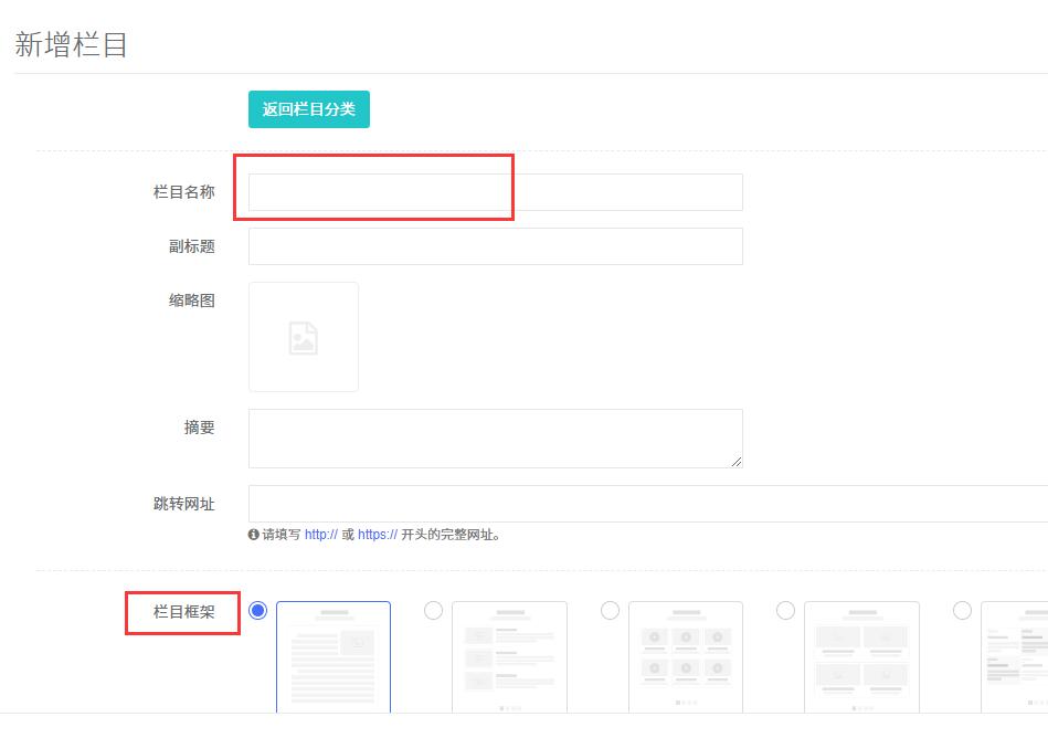 3.进入【新增栏目】,输入【栏目名称】,选择【栏目框架】
