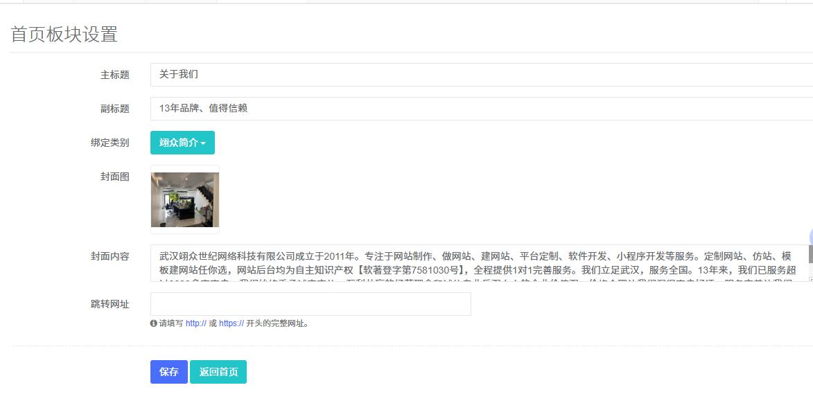 2.进入首页版块设计,按照需要选择栏目绑定,输入栏目主标题,副标题,封面图,封面内容,点击【保存】