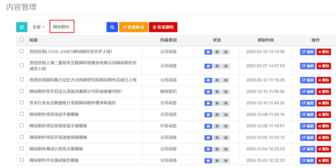 2.在右侧【内容管理】点击【全部】可通过下级菜单栏目搜索文章标题,或者直接在【搜索文章标题框】输入要搜索新闻的字段,点击【放大镜的按钮】