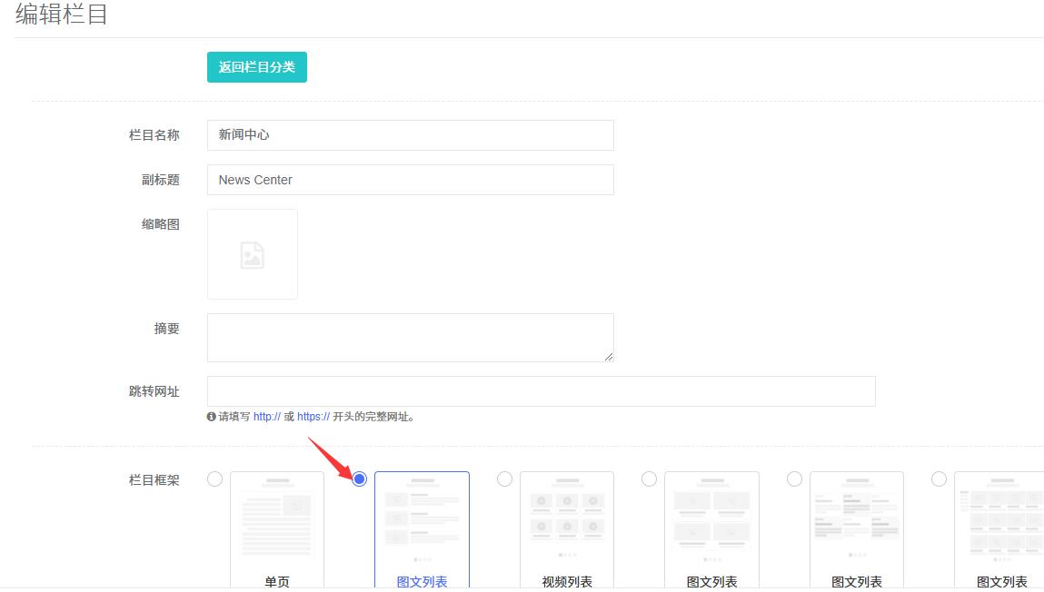 2.进入【编辑栏目】,在【栏目框架】选择第二个【图文列表】