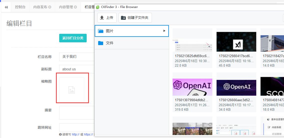 3.进入编辑栏目,点击缩略图,在弹出页面点击【上传】,在弹出窗选择要上传的图片文件(需压缩至1M以下),支持上传格式为jpg、png、gif,再点击【打开】