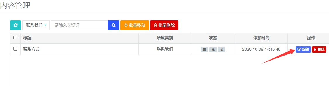 2.进入内容管理,搜索找到联系我们,点击右侧【编辑】