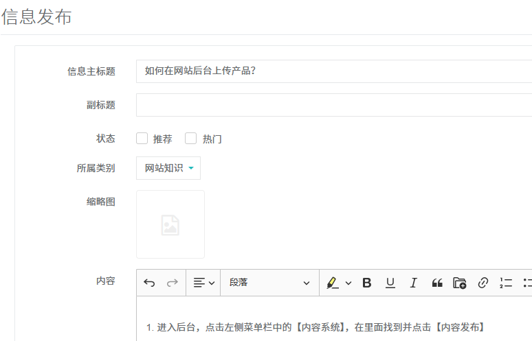 2.进入信息发布按照页面指引填写产品名称,副标题、选择所属产品分类、上传缩略图、产品内容详细图文介绍等相关信息