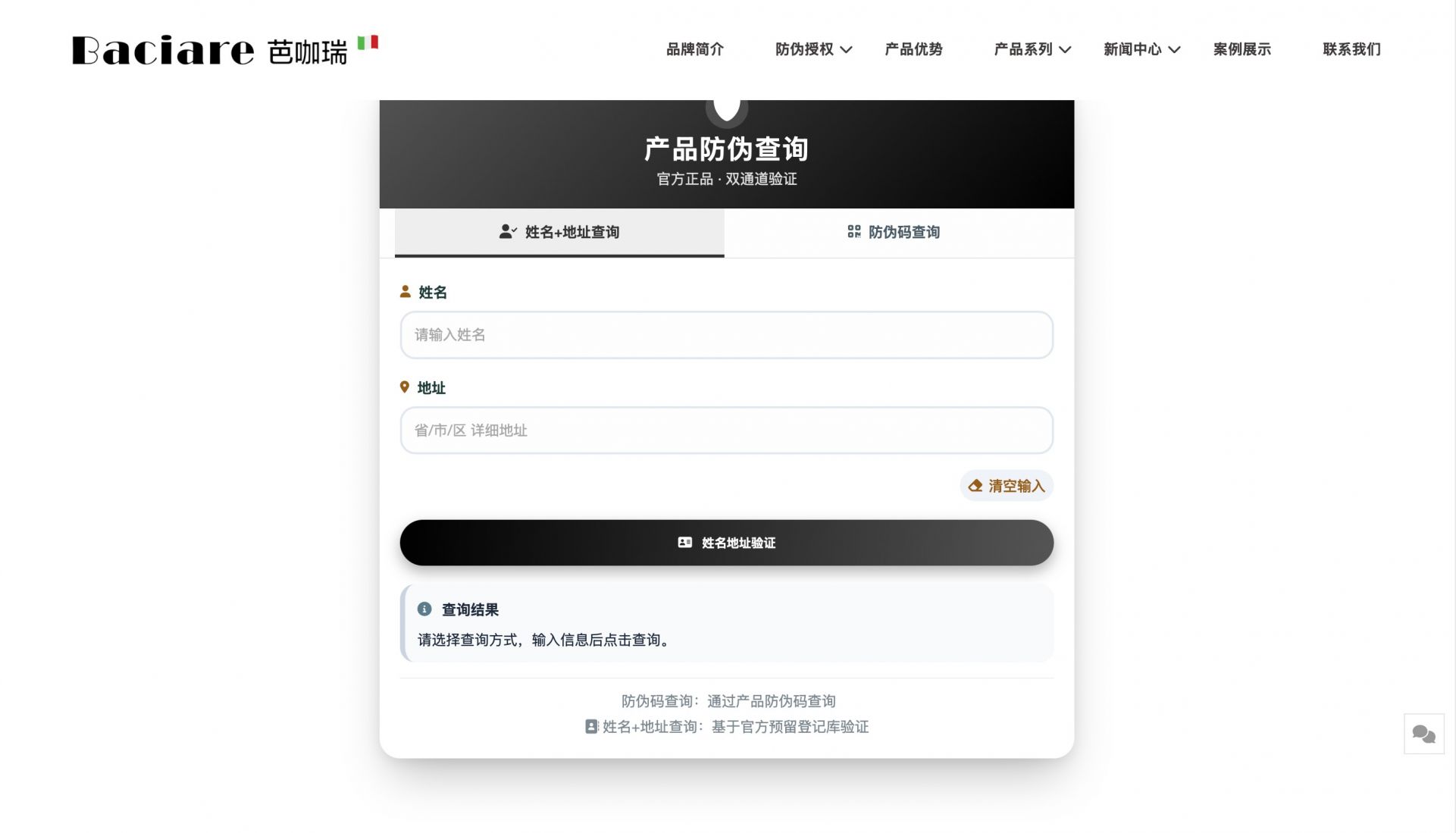 防伪查询分为验证码查询和姓名+地址查询、二维码扫码查询。