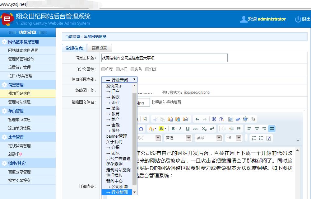 很多网站制作公司没有自己的网站开发后台,直接在网上下载一个开源的代码改改,这样做出来的网站容易被攻击,一旦攻击者把数据清空了那就郁闷了。同时这样做出来的网站后期的调整也很费时费力或者说根本无法深度修改。如下图我们自己的网站后台管理系统: