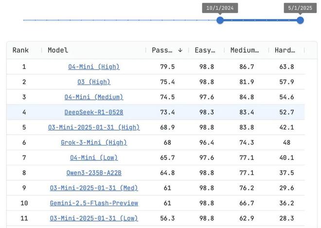 根据 Live CodeBench 测试数据显示,DeepSeek-R1-0528在编程、逻辑推理和交互能力方面表现突出,整体性能接近 OpenAI 的 o3高版本与 o4 mini 模型。