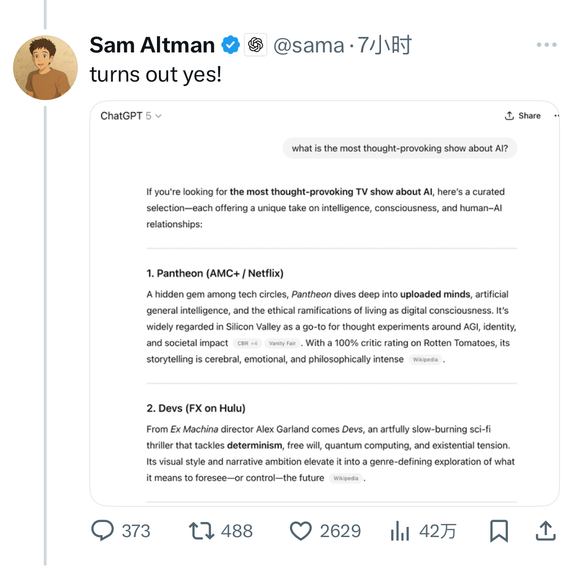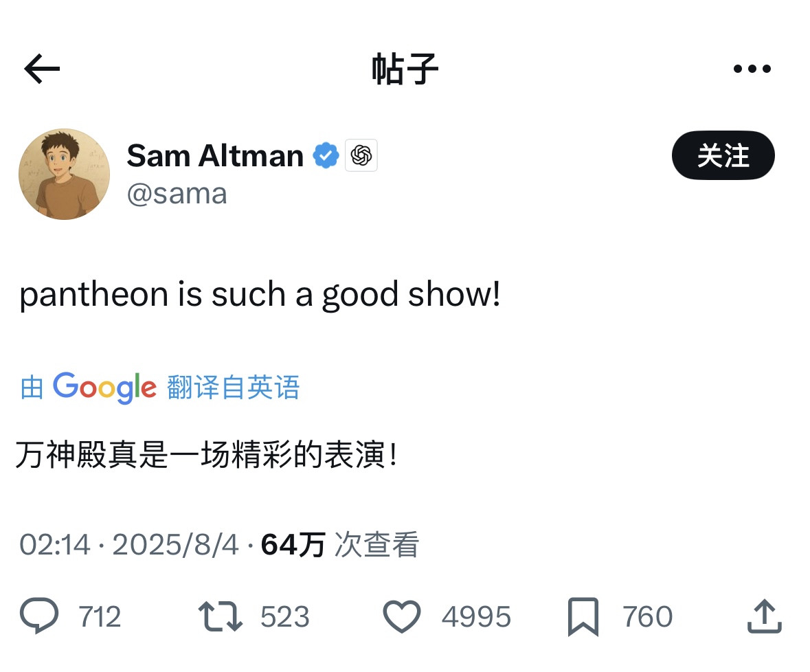 8 月 4 日消息,OpenAI CEO 奥尔特曼今天凌晨在 X 上晒出一张疑似 GPT-5 的截图,奥尔特曼在推文中推荐科幻动画《Pantheon》,这部在科技圈颇具人气的剧集聚焦通用人工智能等议题。评论区有用户追问:“GPT-5 也推荐这部剧吗?”奥尔特曼随即贴出一张聊天记录截图回应:“结果是会!”