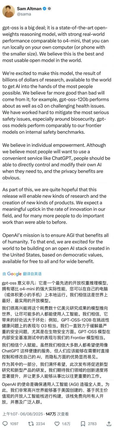 OpenAI表示,两款模型在思路链推理(Chain-of-Thought)、工具调用能力与结构化输出方面表现优异,适用于本地部署、隐私计算及研发创新场景。外部专家已参与其安全评估过程。CEO Sam Altman在社交媒体上表示,这两款模型代表了“数十亿美元研究的成果”,并强调gpt-oss-20b“甚至可以在手机上运行”。