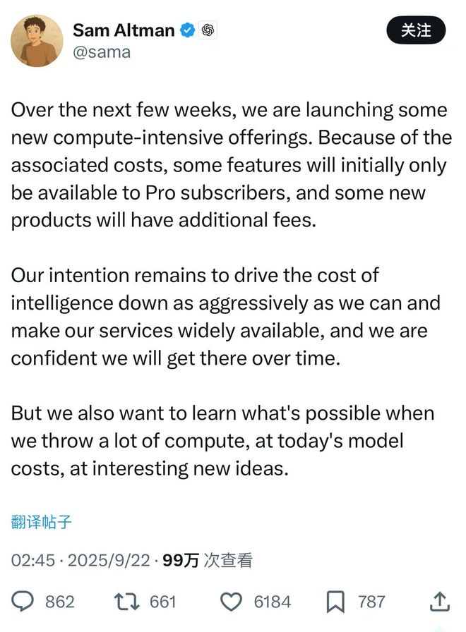 Sam Altman 指出我们的意图仍然是尽可能地降低成本,并使我们的服务被广泛使用,我们相信随着时间的推移我们将逐步实现这一目标。但我们也想了解,当我们以目前的模型成本投入大量计算资源来研究有趣的新想法时,会发生什么。